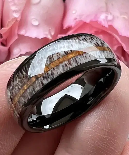 🖤 Tungstène noir haute résistance : Finition matte ou brillante selon la lumière, inrayable et durable 🌲 Bois de cerf véritable : Chaque fibre raconte une histoire unique 🔒 Confort de port : Coupe intérieure ergonomique pour un usage prolongé 🎯 Design affirmé et discret à la fois : Parfait pour les amateurs de bijoux sombres et élégants