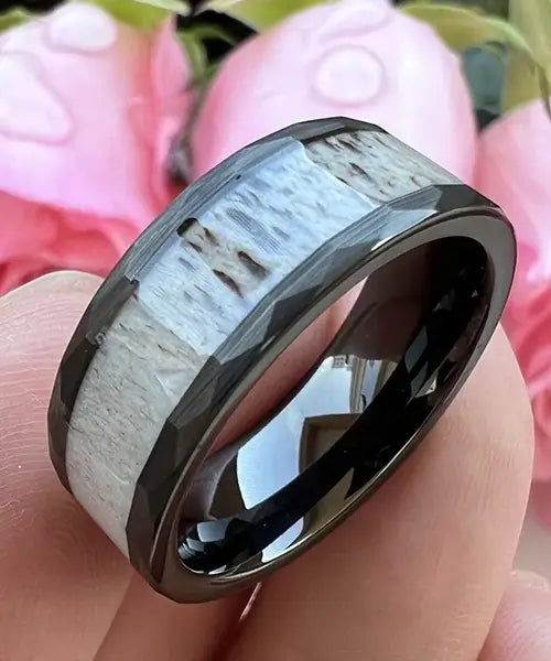 Le bois de cerf, matière rare et renouvelable que les cervidés perdent naturellement chaque année, confère à chaque bague un aspect unique et organique. Sa texture légèrement irrégulière contraste harmonieusement avec la finiton sombre et minérale du tungstène, offrant un bijou au caractère affirmé.
