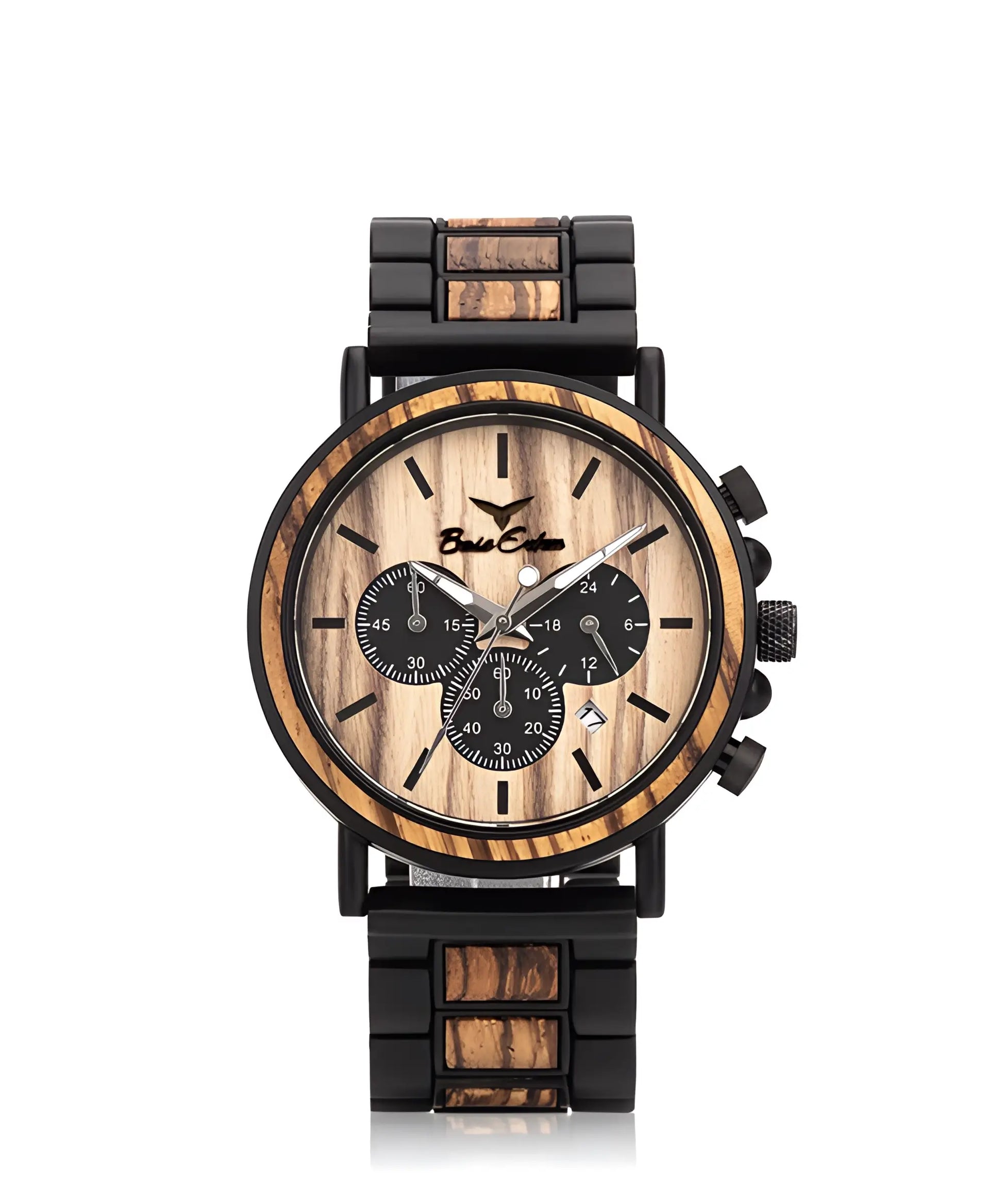 Chaque montre est soigneusement façonnée à partir de bois véritable, sélectionné pour son grain unique et sa teinte chaleureuse. Le boîtier rond mêle bois et acier inoxydable, contrastant avec un bracelet hybride où les maillons métalliques encadrent des inserts de bois sculptés. Le résultat : une présence reconnaissable, immédiatement distinctive.